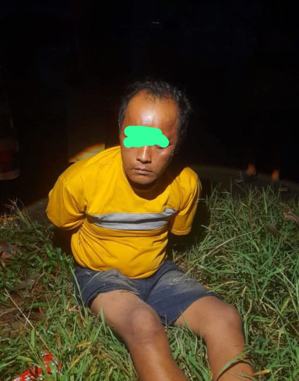 Seorang pelaku mengenakan kaos kuning berhasil ditangkap warga, kemudian tangannya diikat menggunakan tali.