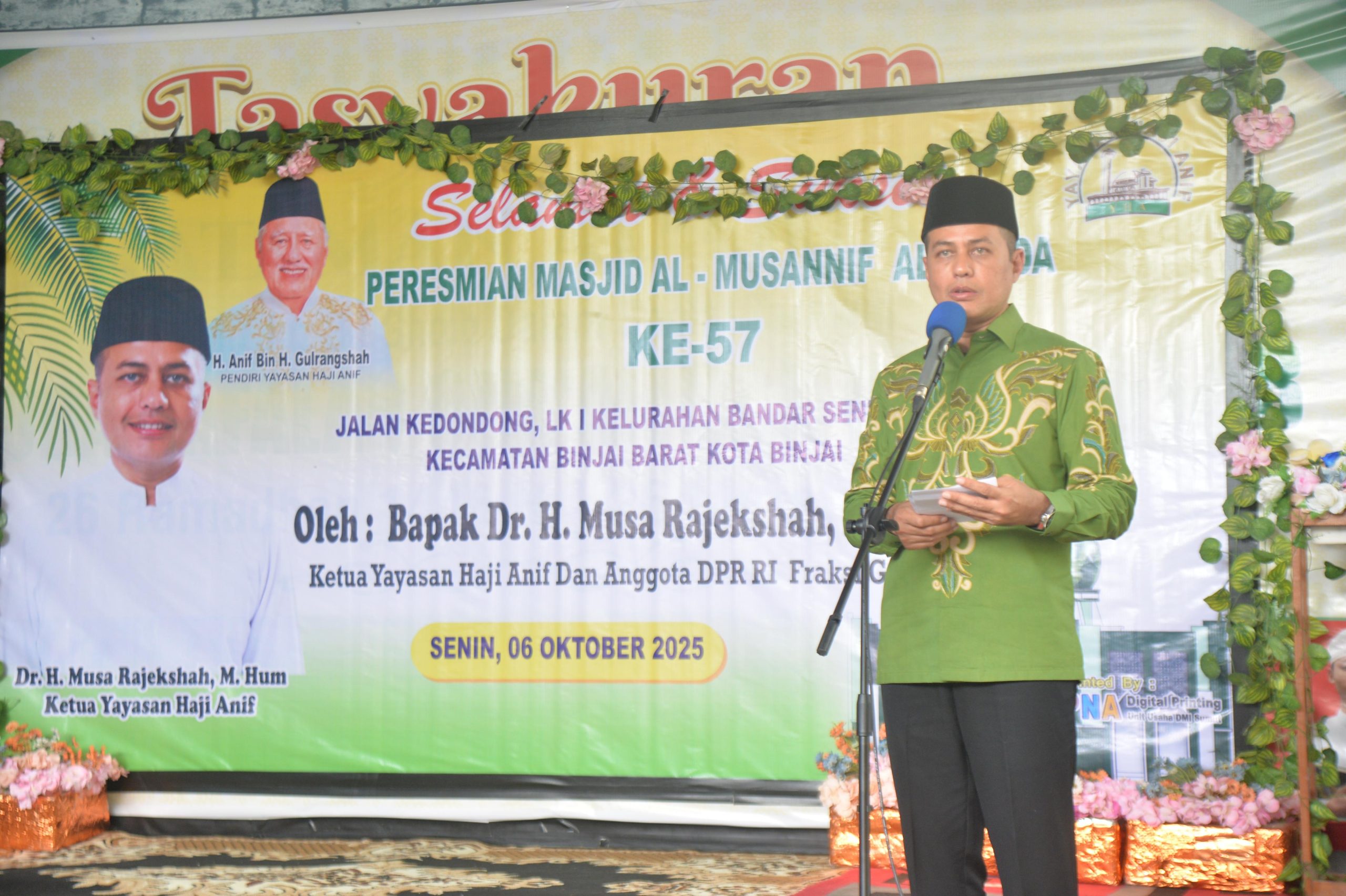 koranmonitor – BINJAI | Ketua Yayasan Haji Anif (YHA) Musa Rajekshah meresmikan Masjid Al Musannif Al Huda di Jalan Kedondong, Kelurahan Bandar Senembah, Kecamatan Binjai Barat, Kota Binjai, Senin (6/10/2025).