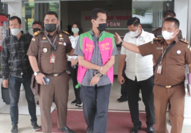DITAHAN. Tersangka AS pakai rompi dengan tangan diborgol dibawa petugas Kejari Medan