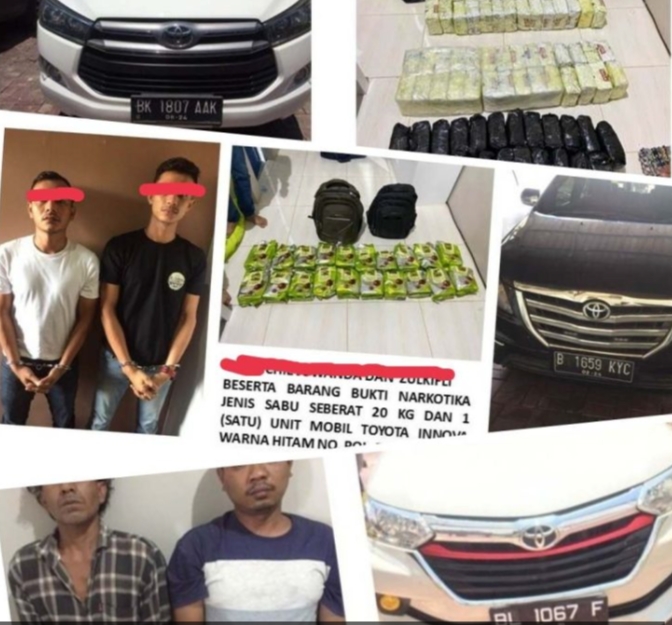 “Bersama tersangka turut diamankan barang bukti 20 bungkus kemasan teh cina berisikan narkotika jenis sabu seberat 20 Kg dan 1 (satu) unit mobil Toyota Innova hitam nomor polisi B 1659 KYC,” jelas Hadi.