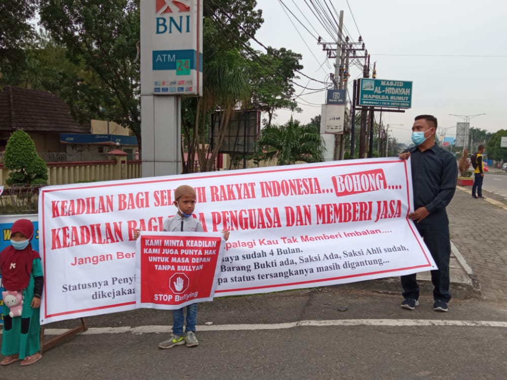 Andi datang bersama istri dan dua anaknya dengan membentangkan spanduk protes atas sikap penyidik Cyber Crime Ditreskrimsus, yang tak kunjung menuntaskan laporannya terkait Putri Bupati Labusel yang telah menghina dan menyebar hoax menyangkut dirinya di Media Sosial.