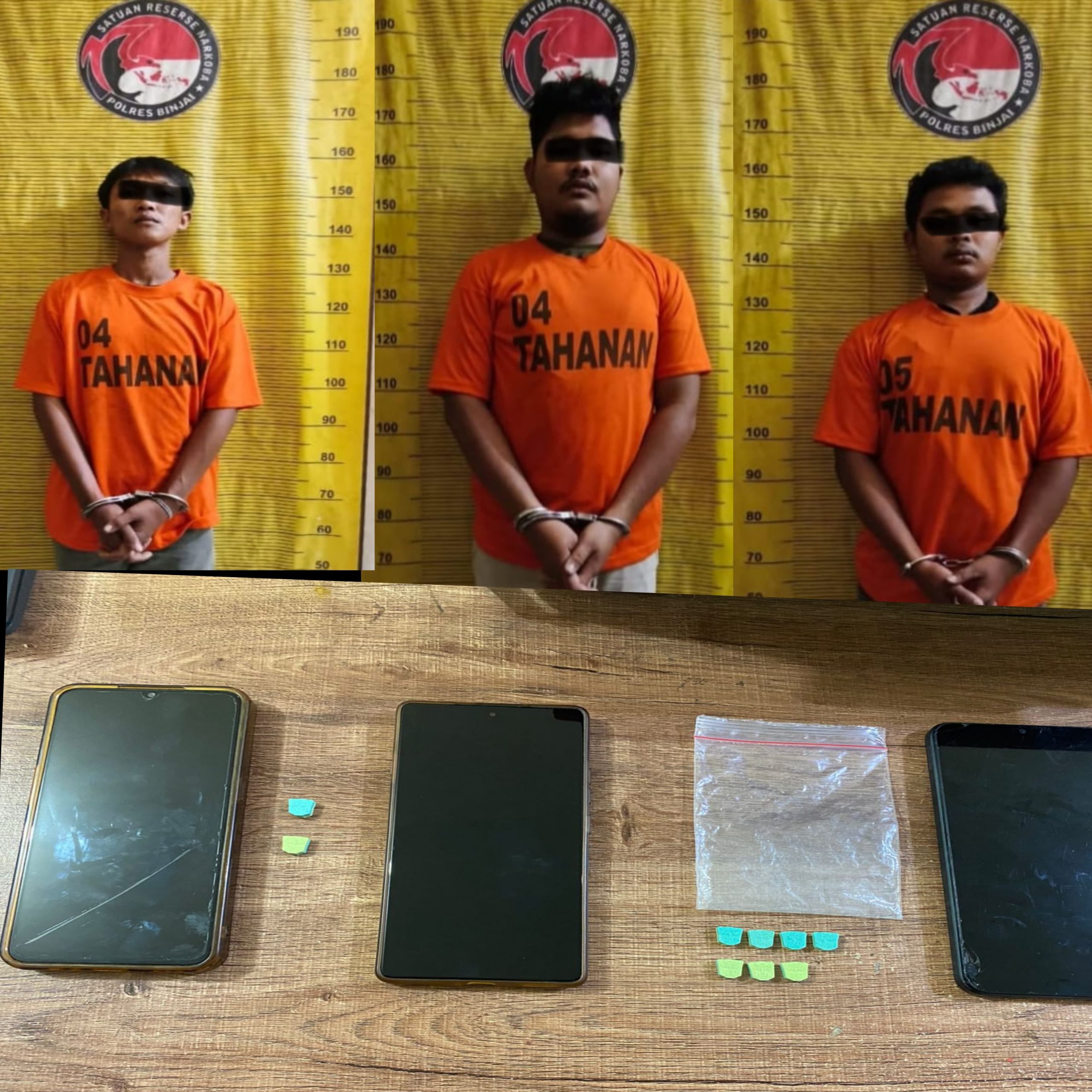 Ketiga pelaku sudah diamankan di Satresnarkoba Polres Binjai, dengan barang bukti berupa. 9 butir narkoba jenis pil ekstasi, dengan berat broto masing-masing berbeda yaitu, 2,76 gram dan 0,79 gram. 3 unit HP dengan merk, Realme, Oppo, dan merk Techno warna silver. Serta 2 unit sepeda motor BK 4737 AGO, dan sepeda motor cokelat warna tanpa Nopol.