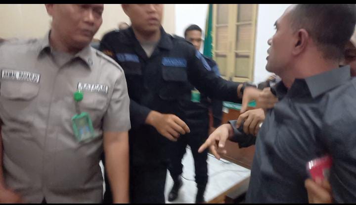 Petugas keamanan dan pengawal tahanan (waltah) pun sigap menuntun terdakwa keluar. Namun ketegangan berlanjut ketika terjadi cekcok antara IFS dan hakim anggota M. Kasim, yang masih berada di ruang sidang.