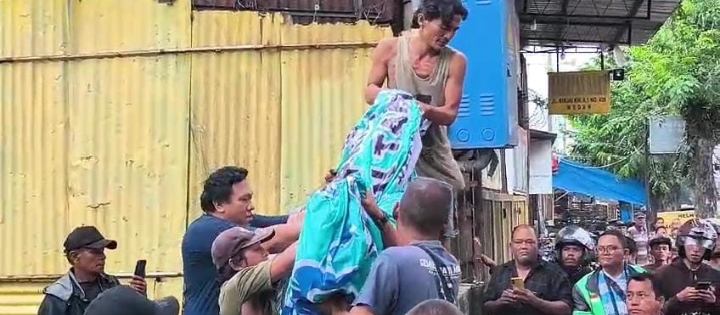 Warga mengevakuasi mayat pria di Medan Helvetia, Minggu (23/11/2025). (Foto. KMC)
