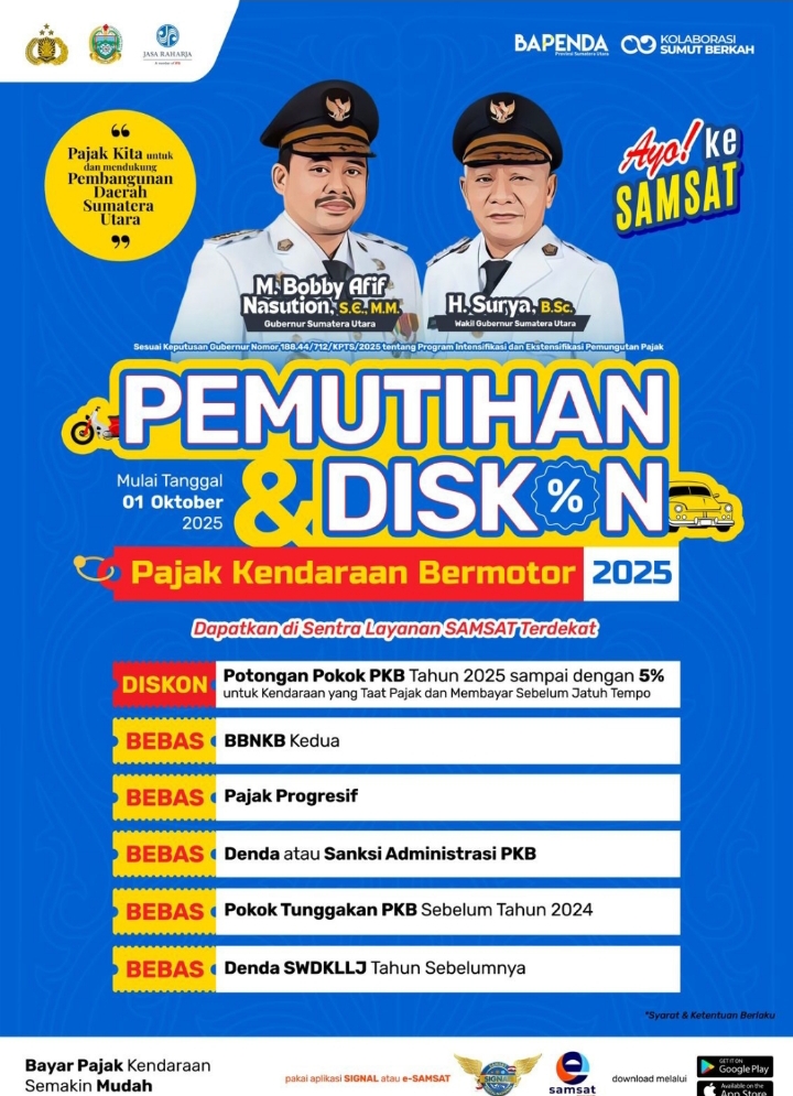 koranmonitor – MEDAN | Pemerintah Provinsi (Pemprov) Sumatera Utara (Sumut) resmi meluncurkan Program Pemutihan dan Diskon Pajak Kendaraan Bermotor (PKB) Tahun 2025 mulai Rabu (1/10/2025). Melalui program ini, masyarakat mendapat berbagai keringanan seperti bebas denda, diskon 5 persen, hingga pembebasan pajak progresif.