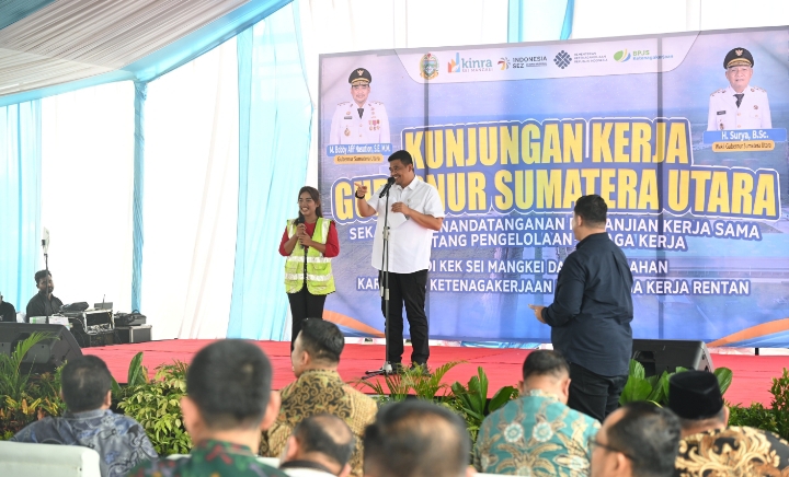 Hal tersebut disampaikan Bobby Nasution saat Kunjungan Kerja sekaligus Penandatanganan Perjanjian Kerja Sama Tentang Pengelolaan Tenaga Kerja di KEK Sei Mangkei, dan Penyerahan Kartu BPJS Ketenagakerjaan bagi Tenaga Kerja Rentan, di KEK Sei Mangkei, Kabupaten Simalungun, Kamis (9/10/2025).