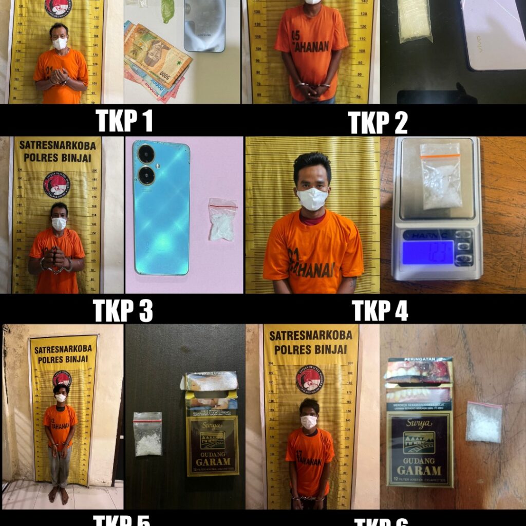 Dalam kurun waktu 1 Minggu, Satresnarkoba Polres Binjai telah mengungkap, dan mengamankan 6 orang tersangka penyalahgunaan dan peredaran narkoba, dari keenam tersangka yaitu inisial. HA (56), S (45), AS (42), DA (25), S (23), dan WTS (24).