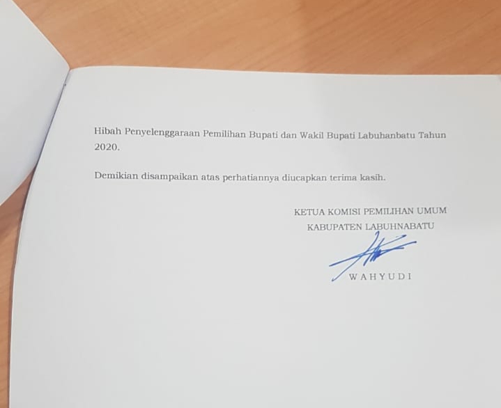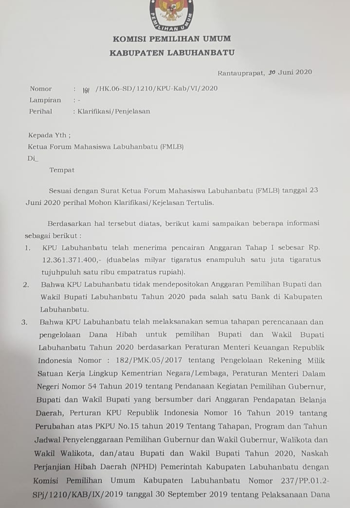 Dijelaskan, dari statement klarifikasi KPUD Lab sesuai nomor Surat 181/HK.06-SD/1210/KPU-Kab/VI/2020 tertanggal 30 Juni 2020 ditandatangani oleh Ketua KPUD Labuhanbatu, Wahyudi sangat bertolak belakang antara balasan dari surat tersebut, sesuai isi berita disalah satu media Online.