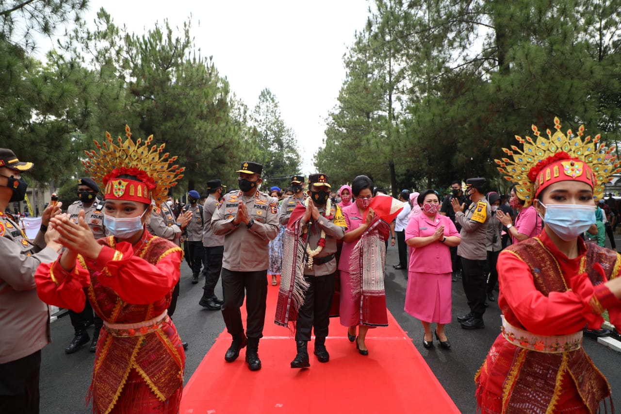 Diiringi tarian etnis, Irjen Pol RZ Panca Putra beserta istri menuju gedung utama Mapolda Sumut. Seluruh kegiatan penyambutan Kapolda Sumut tetap dilaksanakan dengan menerapkan protokol kesehatan guna pencegahan Covid-19.