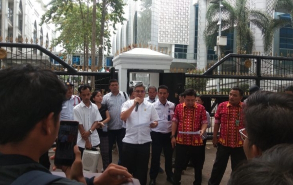 Setelah menggelar mimbar orasi dan menyayikan sejumlah lagu aksi, pengunjuk rasa akhirnya ditemui 2 anggota DPRD Sumut dari Fraksi PDI Perjuangan, Sugianto Makmur dan Dodi Hermanto.